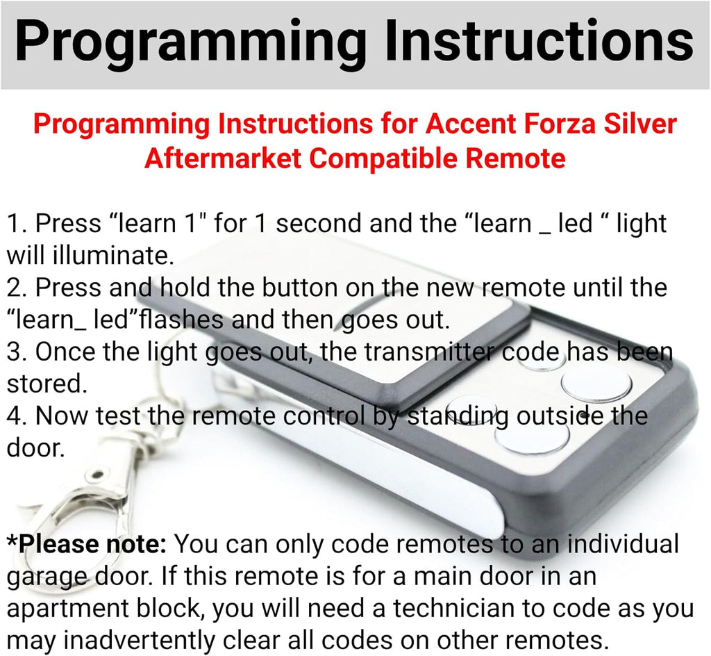Upgrade your garage or gate access with the Accent Forza Silver Compatible Remote Control—a modern, reliable solution for replacing lost or damaged remotes. Designed for smooth compatibility and effortless use, this sleek remote ensures your entry remains safe and simple.