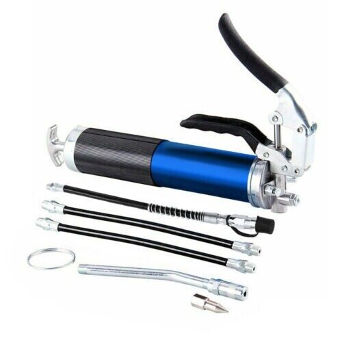 Pistol grip grease gun, 12” flex hose, allows easier zerk coupling in most positions.